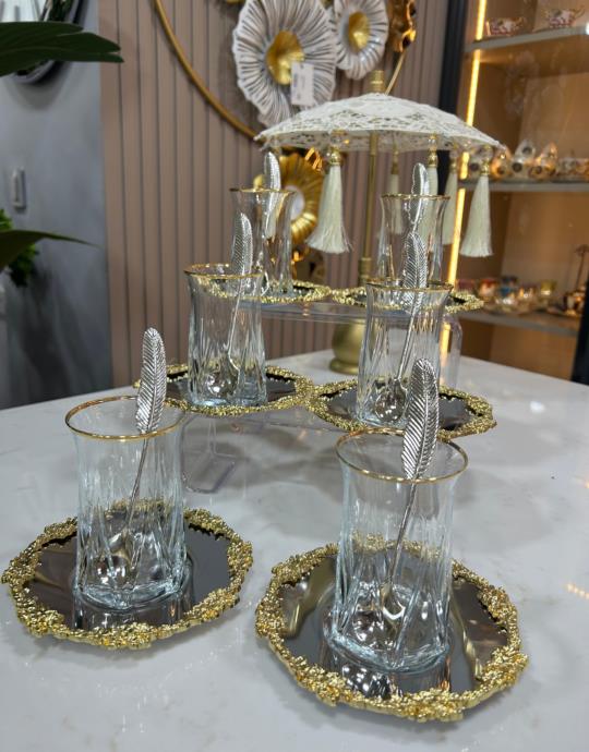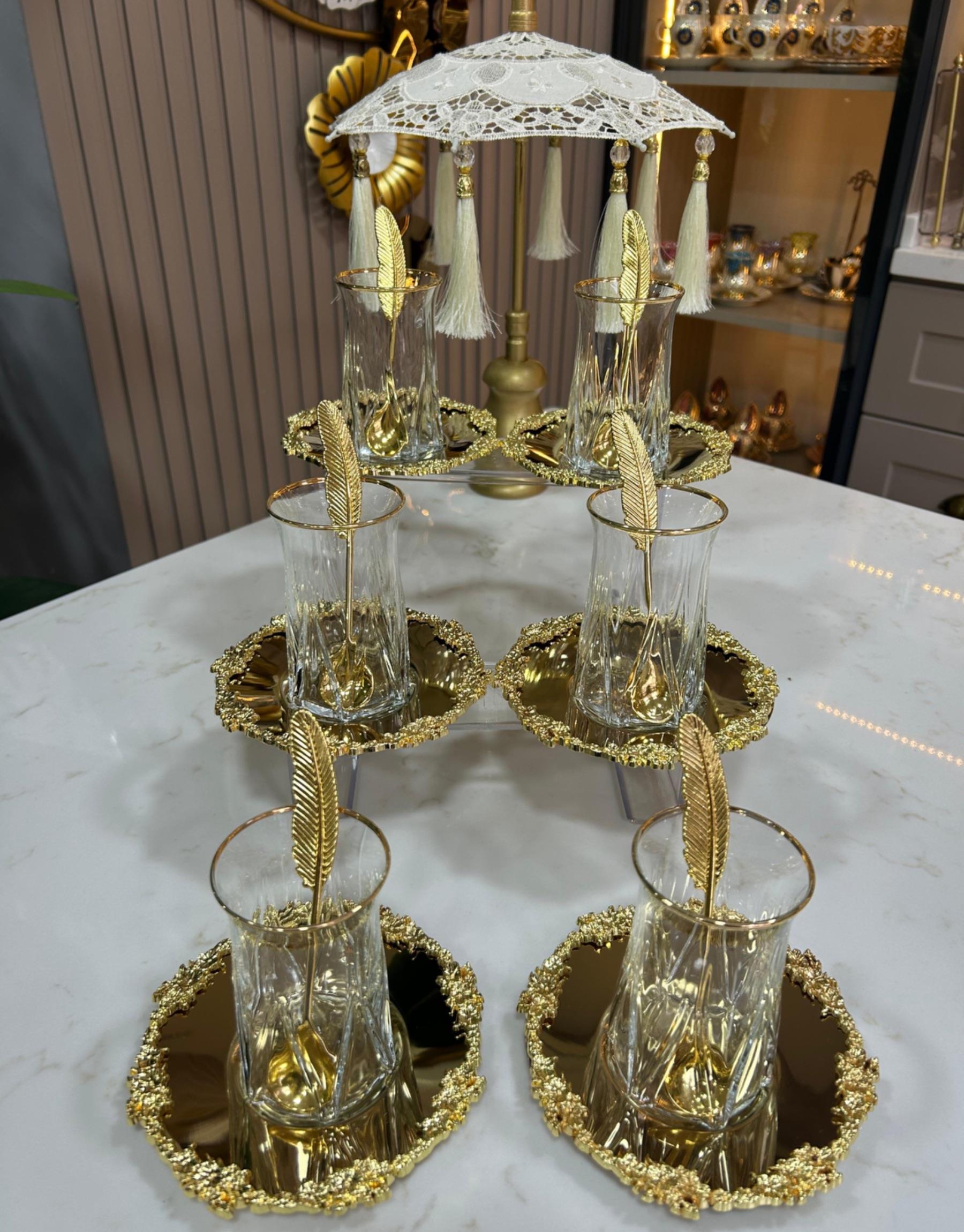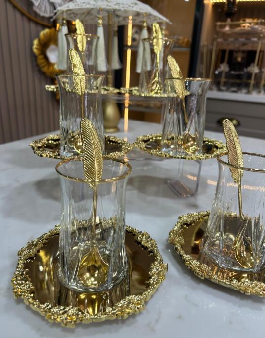 Yaprak Çay Seti Tepsili Komple Set Gold