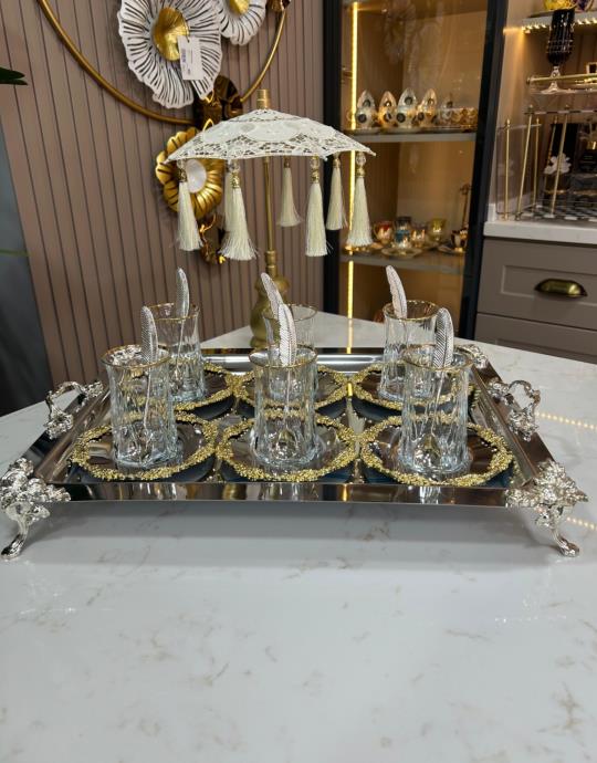 Yaprak Çay Seti Tepsili Komple Set Gümüş